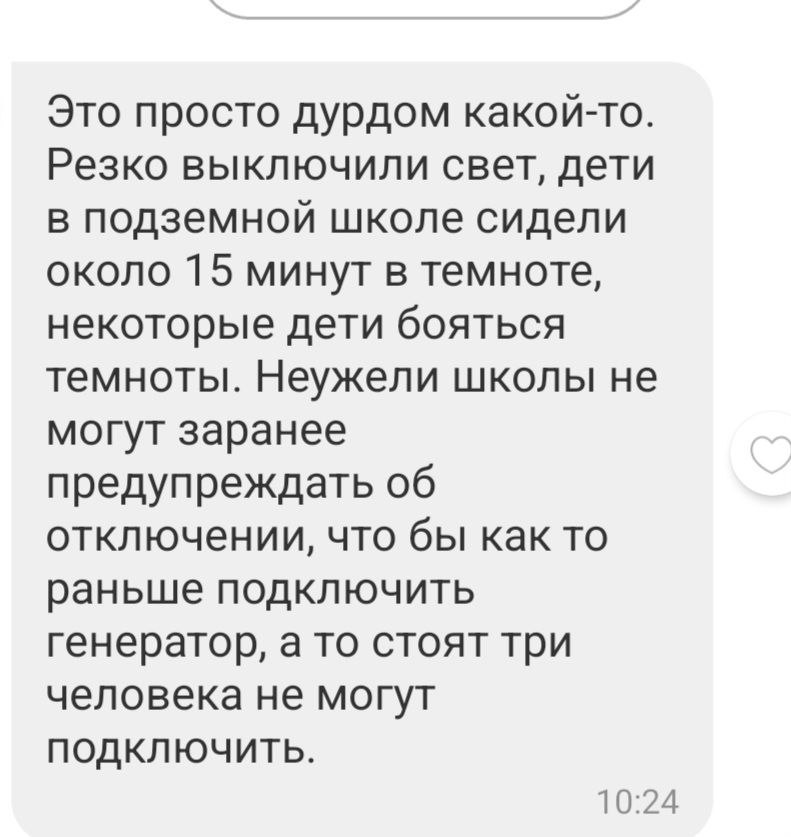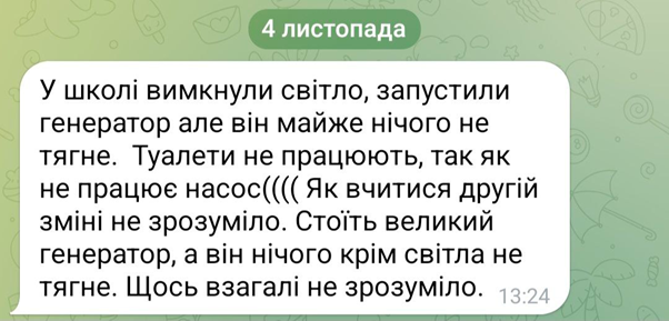 Раніше депутатка Катерина Звєрєва, голова ГО «Хочу вчитись!», розповідала: вчителі скаржаться на надто гучні генератори, які заважають навчанню. Тому їх просто вимикають. Може, звідси й романтизм?
