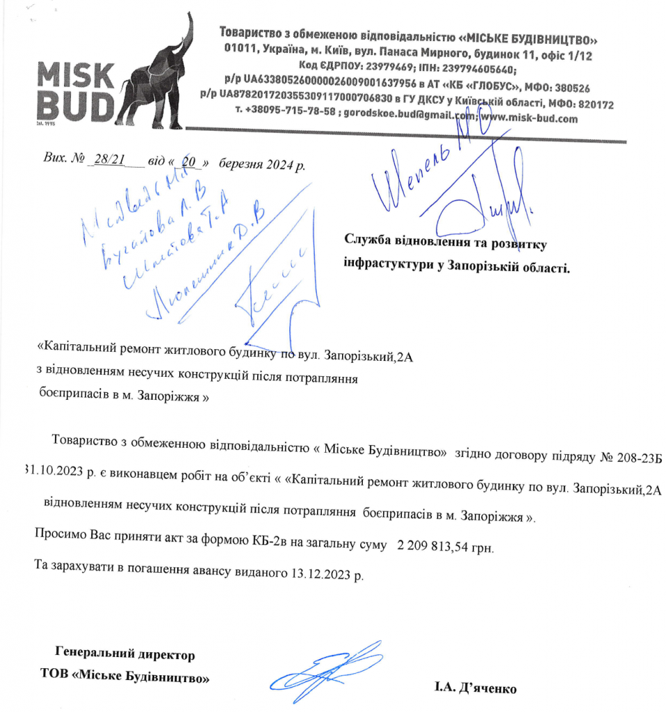 У жовтні 2023 року Служба відновлення в Запорізькій області уклала договір з ТОВ «Міське будівництво» на 117 мільйонів гривень, щоб відремонтувати будинок, який пошкодили ще в березні.