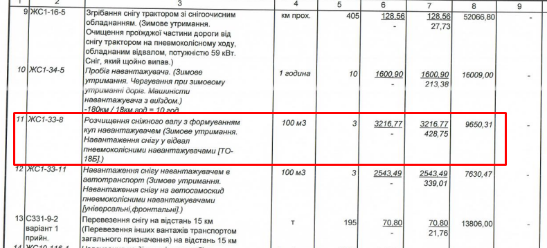 У кошторисі є пункт, який формально стосується схожих робіт — «розчищення сніжного валу з формуванням куп навантажувачем». Проте на ці роботи заклали лише 9 650 гривень, що відповідає прибиранню близько 300 кубометрів снігу на все місто. Очевидно, що цього недостатньо навіть для центральних районів.