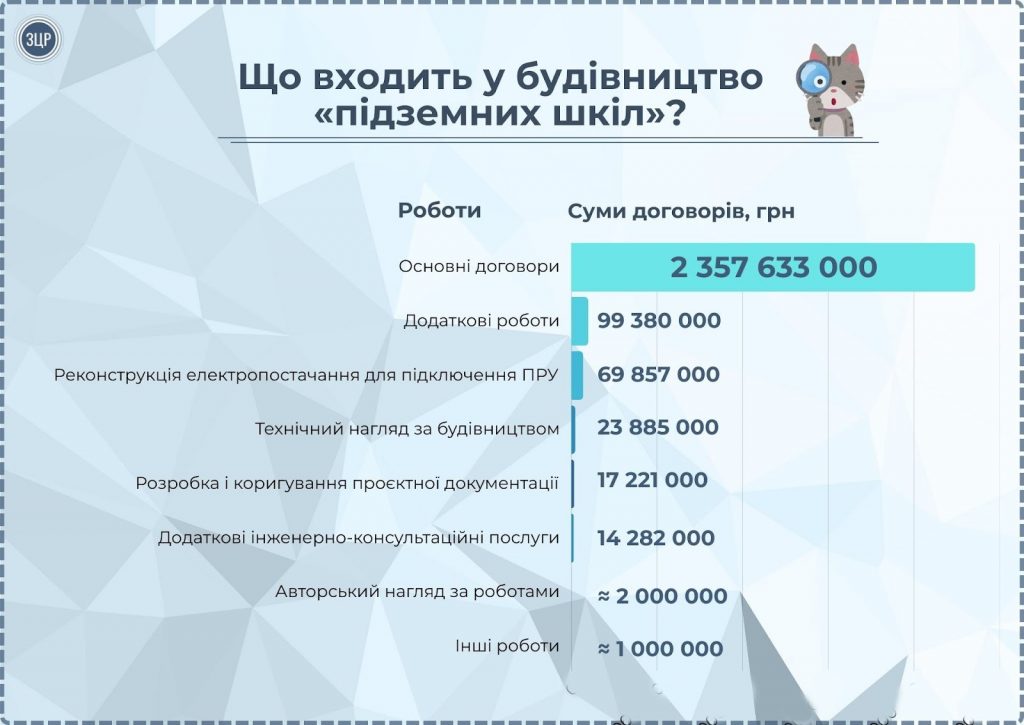 У всіх кошторисах «підземних шкіл», які у 2024-му році перевіряв ЗЦР, ми виявили потенційні завищення цін. У кожному – на декілька мільйонів гривень.