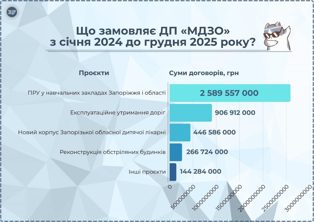 З 1 січня 2024 року до кінця листопада 2025 року ДП «МДЗО» розігналося до роздачі загалом 4,3 мільярда гривень, з яких лише чверть пішла на його основний профіль – дороги. Левову ж частку замовлень склали суто будівельні проекти. Наприклад, вже згадані «підземні школи».