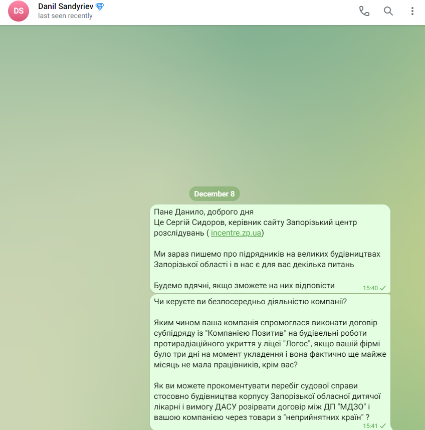 Чи є Данило Сандирєв реальним директором «Будівельної компанії Кальміус»? Ми спробували поставити йому ці запитання через месенджер. Але відповіді так і не отримали.