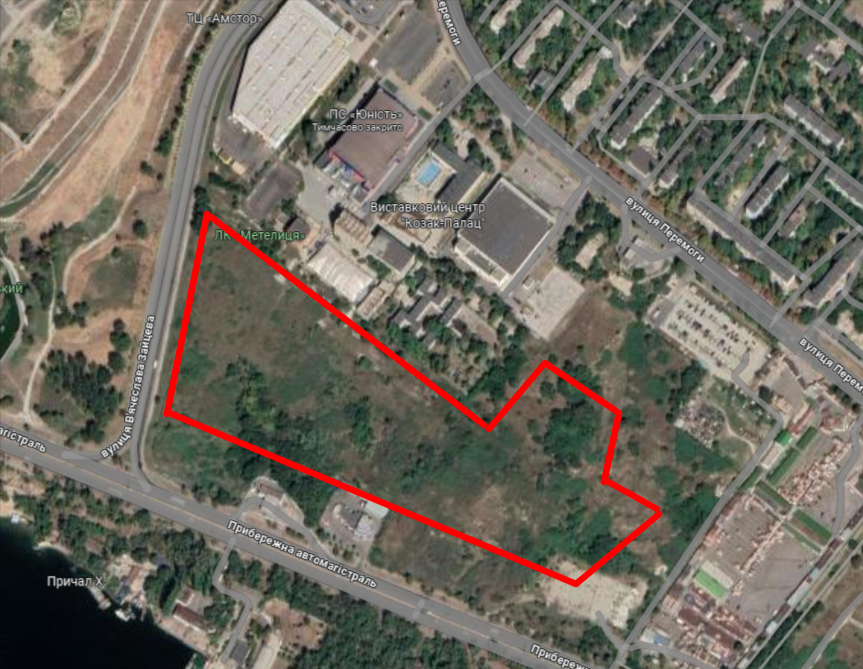 Найбільш «центрове» місце – це незабудована частина схилу над Набережною, від Вознесенівського ринку до вулиці Вячеслава Зайцева. Майже весь похилий пустир площею у 9 гектарів в оренді у ТОВ «Арсенал-сіті».
