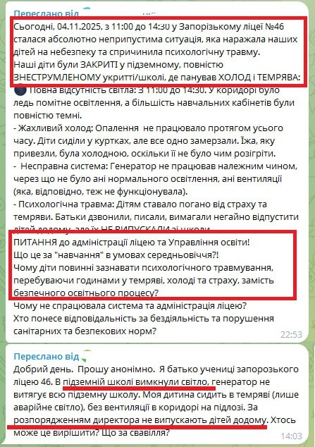 Але щойно у Запоріжжі почалося масове навчання у «підземних школах», як почалися і скарги. Задуха, вимушене сидіння у темряві, непрацююча каналізація…