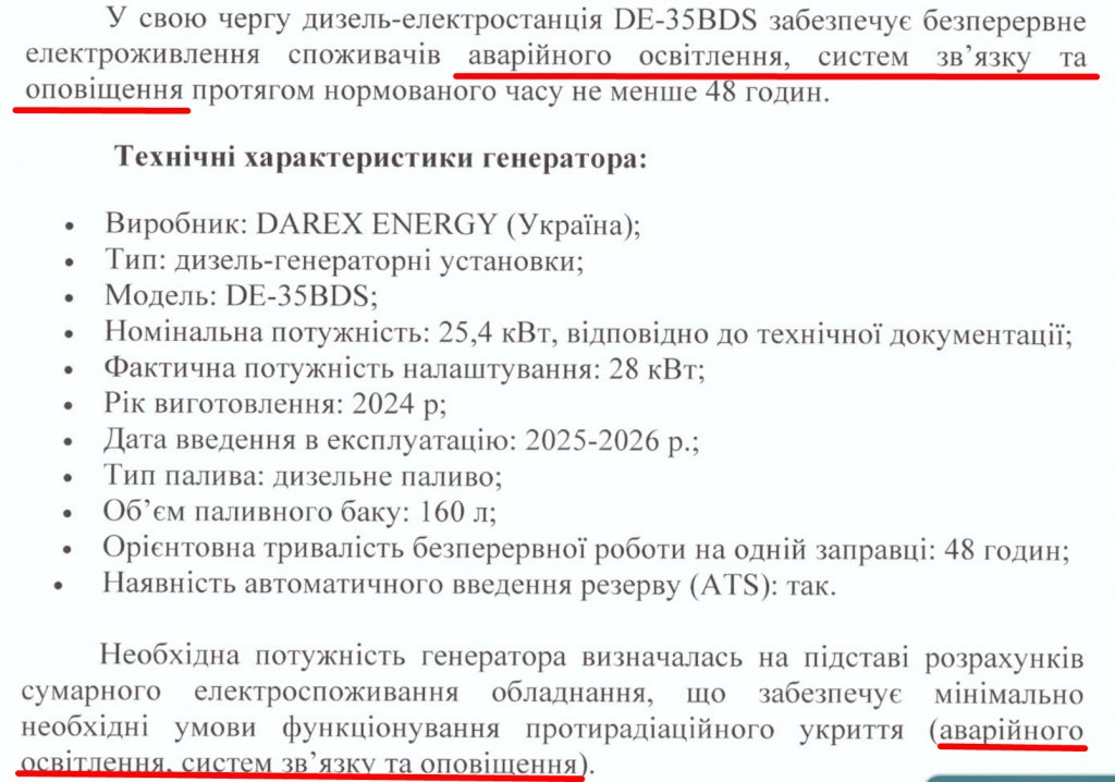 Головне: вони мають забезпечувати 48 годин безперервної роботи на одній заправці. АЛЕ. У ці 48 годин входять аварійне освітлення, системи зв’язку і оповіщення. У відповіді на запит цей перелік повторили двічі.