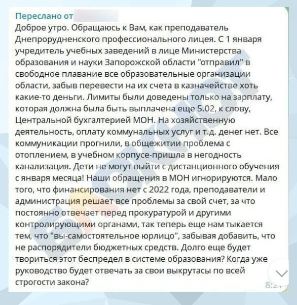 Якщо промисловість помирає, то навіщо платити за навчання людей для неї? Схоже, в 1 січня так зване «Міністерство освіти та науки Запорізької області», створене окупантами, відправило «у вільне плавання» професійні ліцеї та технікуми. Їм дали гроші лише на зарплати, та й ті не заплатили.