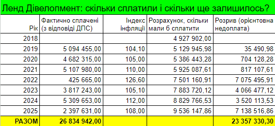 За нашими розрахунками, «Ленд Дівелопмент» могла недоплатити приблизно 23,357 млн грн.