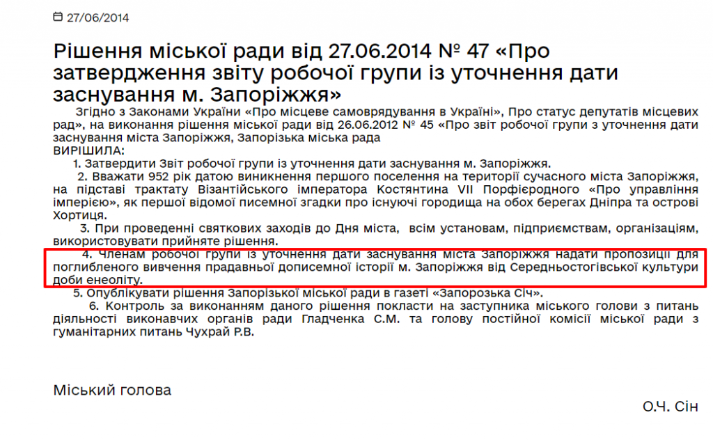 Міськрада визначила, що треба «вважати 952 рік датою виникнення першого поселення на території сучасного міста Запоріжжя, на підставі трактату Візантійського імператора Костянтина VII Порфірородного «Про управління імперією» як першої відомої писемної згадки про існуючі городища на обох берегах Дніпра та острові Хортиця».