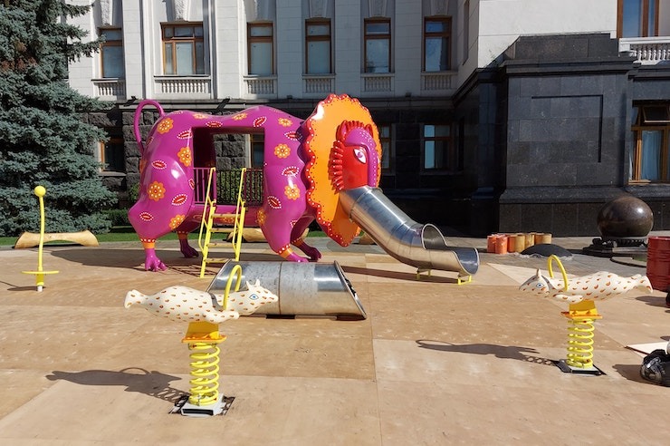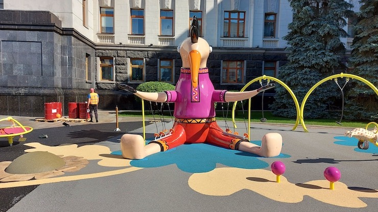 В Олександрівському сквері почали встановлення фігур за мотивами творчості Марії Примаченко. Такі само, як ті, що 4 роки тому ставили перед Офісом Президента Зеленського. Фірма, що робить ремонт скверу, отримала на це додаткові мільйони гривень
