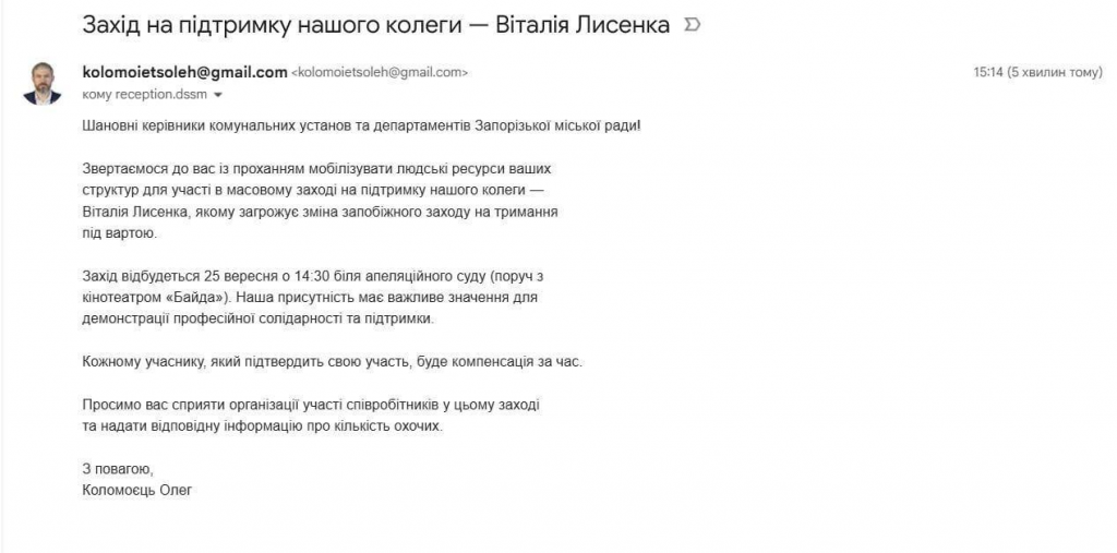 Напередодні серед медіа та активістів розповсюдили нібито скріншот листа одного із запорізьких депутатів до міських департаментів та комунальних закладів. На знімку був заклик прийти до суду і підтримати Віталія Лисенка за винагороду.