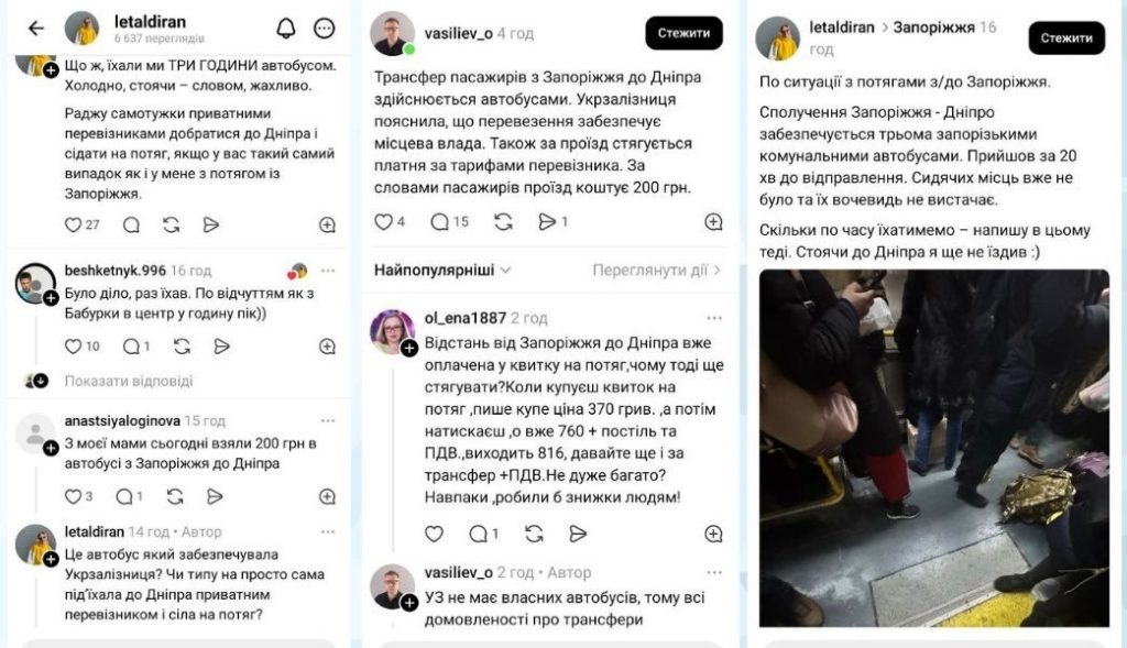 Поїздка тривала три години, автобус був холодним, а їхати довелося стоячи. «Краще вже приватним транспортом», – резюмує авторка. Співробітники вокзалу «Дніпро-Головний», куди ми змогли додзвонитися у п’ятницю, також порадили дістатися до них самостійно і сідати на поїзд із купленими від Запоріжжя квитками.