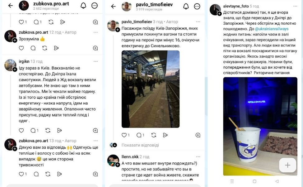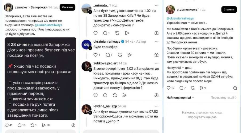 У Запоріжжі новина стала резонансною: із наближенням фронту і посиленням обстрілів транспортне сполучення – життєво важливе питання. Обговорення почалося із фейкового скріншоту про те, що із «Запоріжжя-1» поїзди не відправлятимуть у тривогу. Оскільки у ті дні тривога у місті практично не завершувалася, виникло запитання: скільки ж годин доведеться чекати у холодному підземному переході?