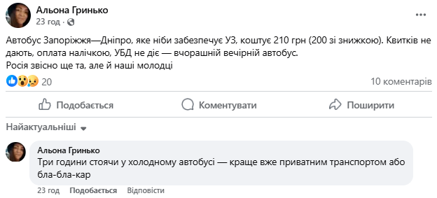 Тим часом на вихідних пасажири трансферних рейсів почали скаржитися у Threads та Facebook. За повідомленням Альони Гринько, за проїзд автобусом із Запоріжжя до Дніпра з пасажирів взяли по 210 гривень. Для пільговиків вартість знизили до 200 грн, а військовим у формі дозволили їхати безкоштовно. При цьому квитків за проїзд не видавали.