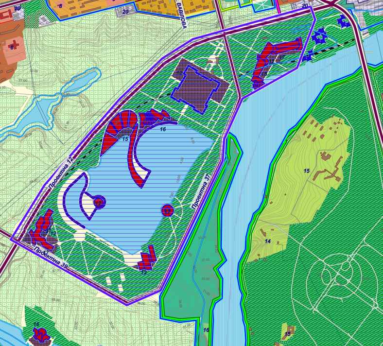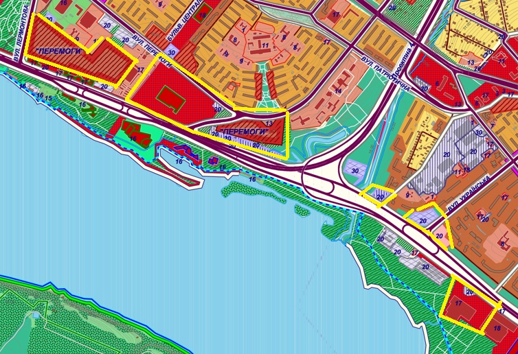 Червоний «бумеранг» у правому верхньому куті – це майбутні заклади культури і спорту на місці нинішніх цехів із дроблення граніту на щебень та терміналів для його завантаження. Того індустріального пейзажу, який ми можемо спостерігати з Арочного моста.