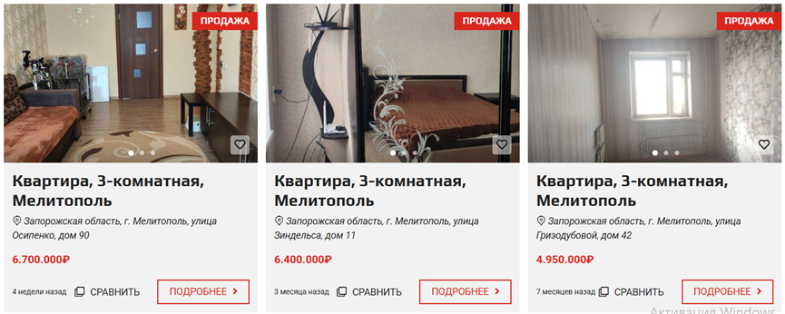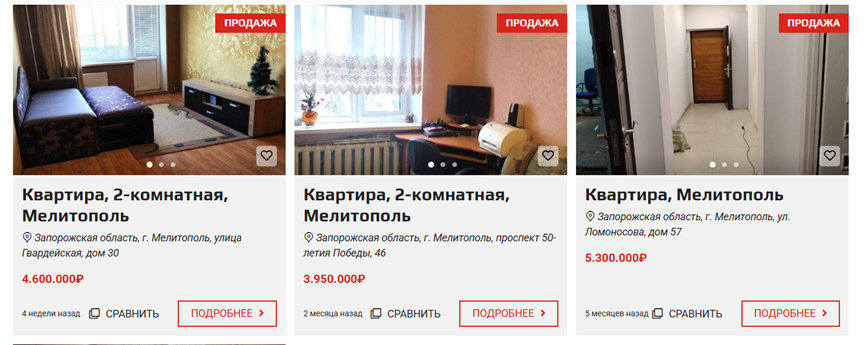 Ринок житла в окупованих Мелітополі та Бердянську також зазнав значних змін. У Бердянську більшість оголошень про продаж нерухомості на популярній платформі «Авіто» розміщують приватні особи. У Мелітополі ж активно працюють як приватні продавці, так і агентства нерухомості.