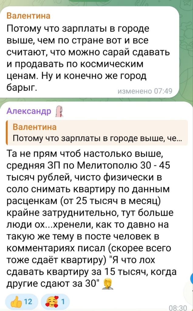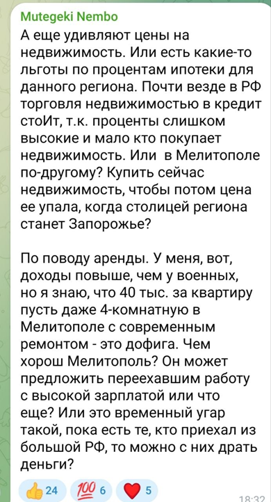 Цифри в оголошеннях здорово обурюють окупаційних блогерів у TikTok. Вони порівнюють ціни на нерухомість у Мелітополі з іншими містами Росії – наприклад, в Орлі житло значно дешевше. Кажуть, що ціни можуть бути нижчими навіть у Криму. Коментатори стверджують, що купити житло в Мелітополі стало «нереально дорого», а ціни, на їхню думку, необґрунтовано високі.