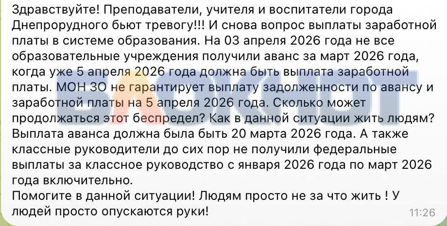 У Дніпрорудному, за словами педагогів, аванс за березень мав надійти ще 20-го числа. Не надійшов. Зарплату обіцяли 5 квітня — теж немає. Стабільно не надходять і так звані «федеральні виплати» класним керівникам: їх не бачили з січня до березня. Тобто три місяці люди працюють фактично «за ідею».